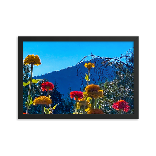 Nature Photographic Art Poster - Zinnias+Mountain - with Frame