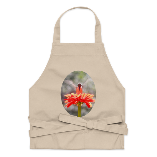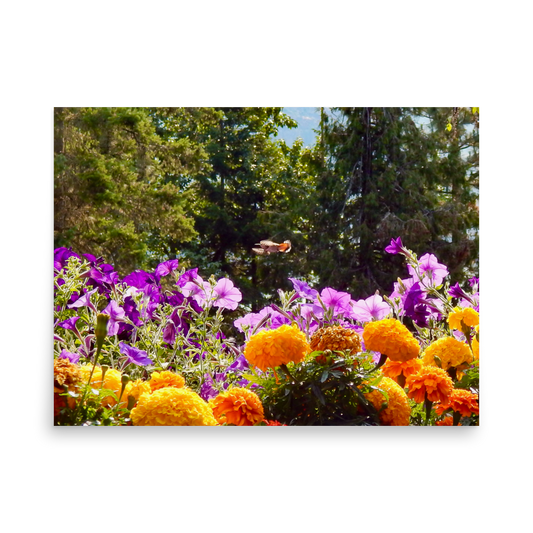 Nature Photographic Art Poster - Orange Marigolds and Purple Petunias with Hummingbird